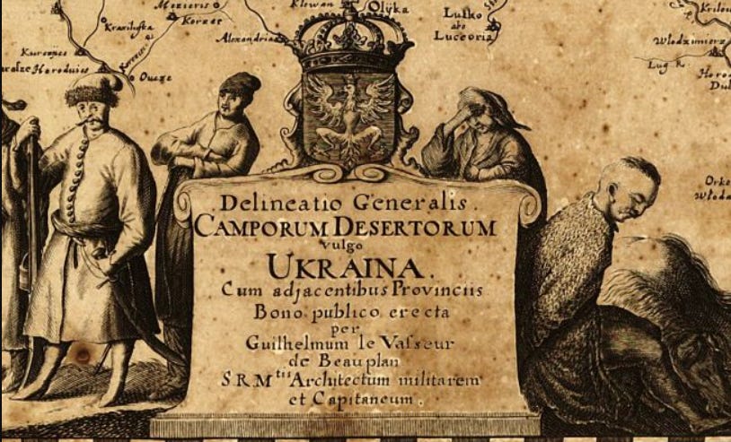 تمثل هذه الصورة واجهة إحدى أقدم الخرائط الأوروبية التي حملت اسم "أوكرانيا" بصيغته الحديثة، وهي من إعداد المهندس والرسام العسكري الفرنسي غيوم لوفاسور دي بوبلان (Guillaume Le Vasseur de Beauplan)، ونشرت في منتصف القرن السابع عشر، تحديدا في عام 1648، في خضم التوترات الإقليمية بين الكومنولث البولندي الليتواني، والإمبراطورية العثمانية، وروسيا القيصرية.