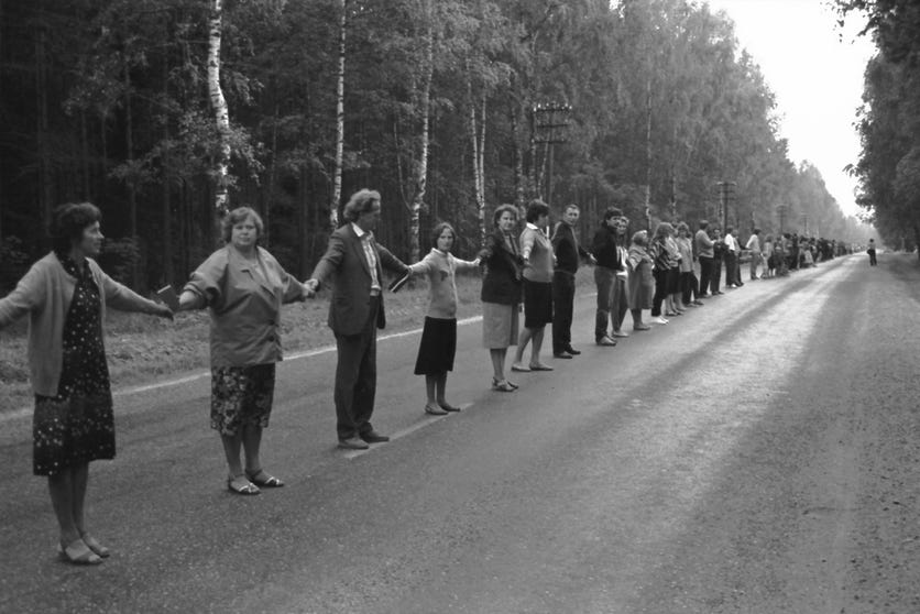 لو كنا قد اخترنا عدسة "التحرّر"، لربما أصبحت صور "الطريق البلطيقي" (Baltic Way) أيقونية بقدر سقوط جدار برلين. فعلى صعيد الأعداد والامتداد، كانت تلك المظاهرة أضخم بكثير من لحظة انهيار الجدار: حوالي مليونَي شخص تشابكت أيديهم ليشكلوا سلسلة بشرية بطول 670 كيلومترًا عبر ثلاث دول، وهو إنجاز جماعي أعقد وأوسع من تجمع نصف مليون شخص في مدينة واحدة بشكل عفوي. ورغم ذلك، فإن نتائج البحث في غوغل عن "الطريق البلطيقي" لا تتعدى الآلاف، بينما تصل نتائج "سقوط جدار برلين" إلى الملايين.